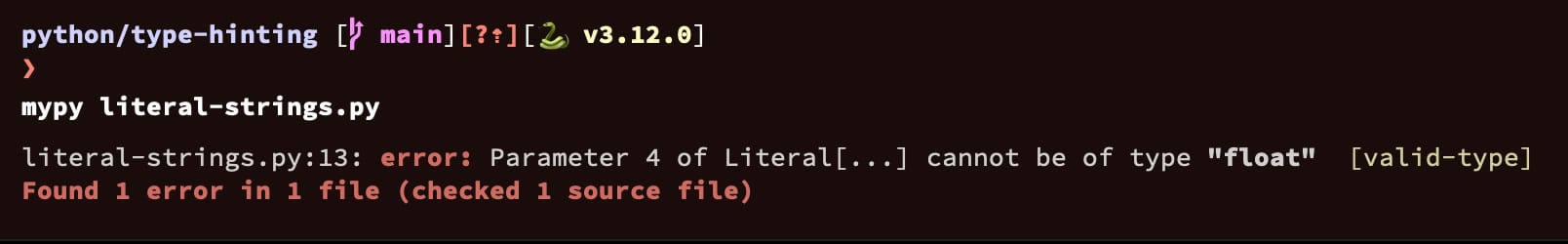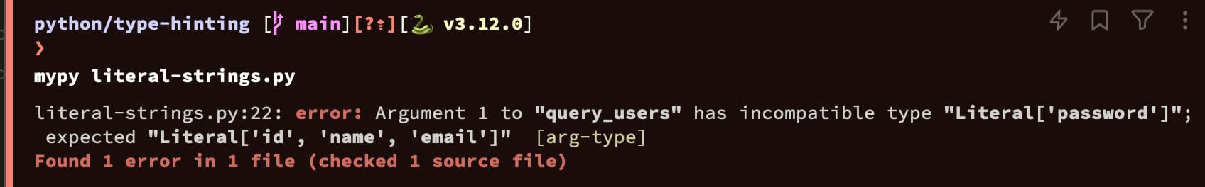 mypy showing an error when passing an unexpected valueThis example showcases how Literal Types enhance code clarity and enforce database integrity by restricting function parameters to specific, permissible values.