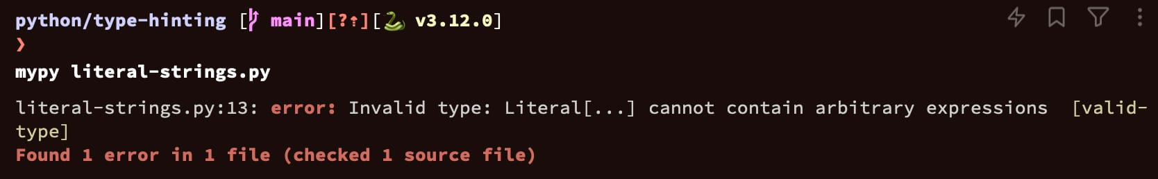 mypy showing the error when using an expression as a type parameter to LiteralUnderstanding and applying these rules empowers us to fully leverage Literal Types' potential in Python. It ensures that your code is precise, highly readable, and maintainable, with fewer errors and misunderstandings.