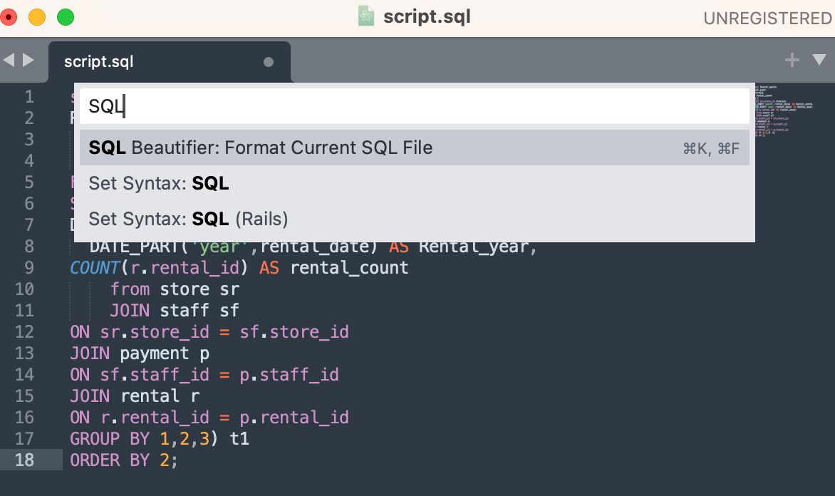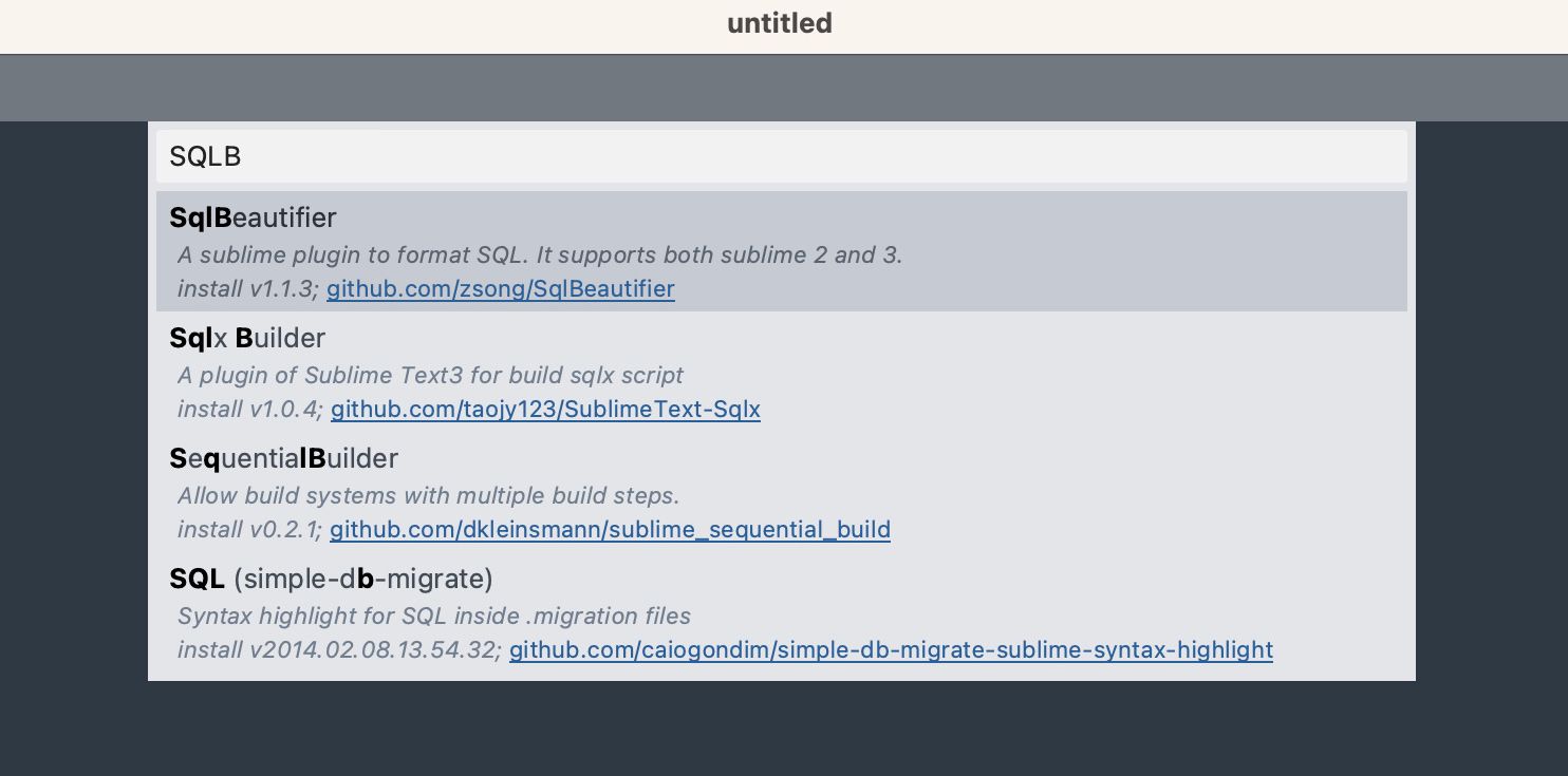 After downloading and installing Sublime Text from the official website. We should do some SQL specific configuration to help us write well-formatted SQL code.